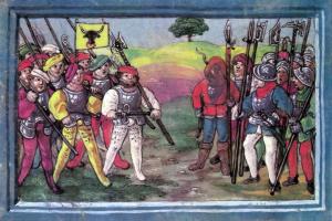 | Begrüssung des Urner Zuzuges vor Chur. Die Frühlingslandschaft täuscht: Der Winter 1498/99 bleibt lange als "harter Winter" in Erinnerung. |