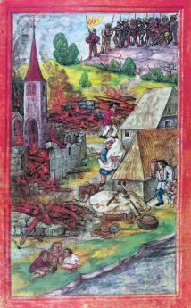 Das verwüstete Dorf Sennwald mit seiner "rothen Kilchen". Das Bild weist auf zwei Wundergeschehen hin, die sich während dieses Raubzuges ereignet haben sollen: Beim Brand der Kirche schmilzt zwar die metallene Monstranz auf dem Altar in der Hitze, die Hostie aber bleibt unversehrt. Und zwischen spielende Kinder trifft eine Kanonenkugel, ohne Schaden zu stiften. Die schwäbischen Knechte halten es nicht anders als die "frommen" Eidgenossen: Sie tragen als Beute allen Hausrat zusammen; Bettzeug, eine Wiege und Pfannen. Im Hintergrund schwäbische Truppen. |