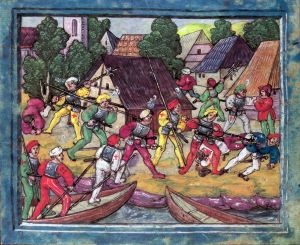 | Schwäbische Kriegsknechte von der nahen Insel Reichenau landen in Ermatingen. |