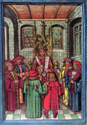 König Maximilian mit dem Reichszepter in der rechten Hand eröffnet die Versammlung der Abgesandten der Reichsstädte in Zell am Untersee. Festlicher Innenraum mit hölzerner Tonnendecke, Quadermauern mit Zangenlöchern, Butzenscheibenfenster mit Windeisen und Schiebern, der Boden mit Schachbrettmuster. |