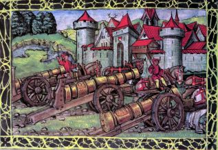 Solothurn ist zwar nicht vom Stadtbild her, aber doch mit der im Hintergrund mäandrierenden Aare und dem Wappen über dem Tor zu erkennen. Drei mit den königlichen Lilien geschmückte Steinbüchsen sind eben angekommen. Der zweispännige Zug bestätigt, dass es sich nicht um einfache Feldschlangen handelt, die meist mit einem Pferd bewegt werden. Die hinteren zwei Stücke haben hölzerne Richthörner auf den Lafetten, um die Rohre in der Höhe verstellen zu können. Das vorderste Geschütz mit kurzem, dickem Rohr sitzt als reines Belagerungsgeschütz fest auf seinem Untergestell. |