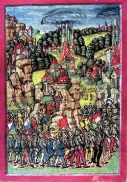 Die Hegauer Landschaft ist geprägt von aufragenden Vulkankegeln, auf denen schwer zugängliche Burgen wie Hohentwiel und Hohenkrähen sitzen. Schilling zeigt diese typischen Hegauerburgen auf ihren Feldtürmen. Der Rauch brennender Burgen verdunkelt den Himmel. An ihren Fähnlein lassen sich die Teilnehmer an dieser Unternehmung erkennen: Die fünförtige Urschweiz und Zürich. |