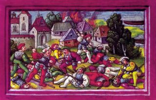 Vor dem Städtchen Rheineck überfallen schwäbische Truppen die eidgenössischen Wachen. Hinter Bäumen und Sträuchern in einem Arm des alten Rheins die Nauen, mit denen die Angreifer heimlich gelandet sind. |
