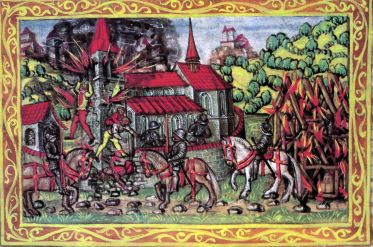 Die Kirchhofmauer von Thayngen ist gebrochen, nun wird der wehrhafte Turm der Kirche gesprengt. Ein Vater springt mit seinem Knaben aus einem raucherfüllten Turmgeschoss. Im Vordergrund schwäbischer Adel, gegen den Horizont erheben sich die typischen Hegauer Burgen auf ihren Vulkankegeln. |