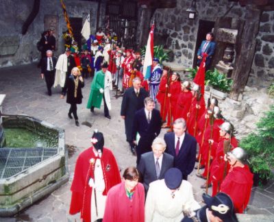 Im Innenhof schreiten die Regierungsvertreter durch den Spalier der historischen Harstgruppen. |