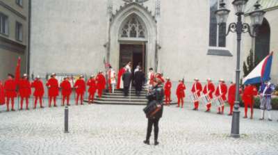 Vor dem Dom St. Nikolaus werden die Gäste von der Harstgruppe der "roten Schwyzer" empfangen. |